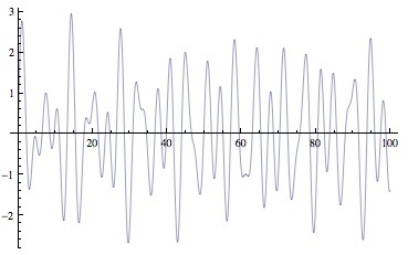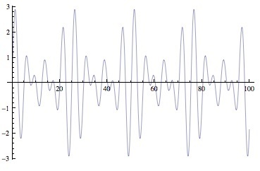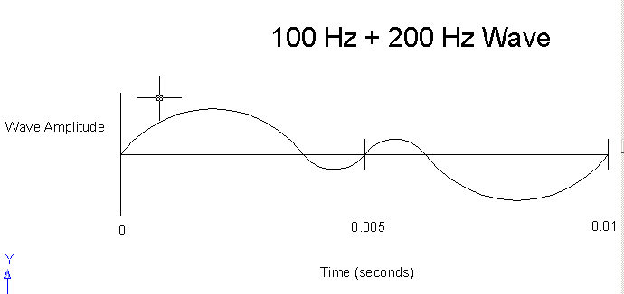If a 100 Hertz and 200 Hertz tones sounded at the same time, the phonograph would have to add them together (taking into account positive and negative regions). The resulting wave would look like the picture below.