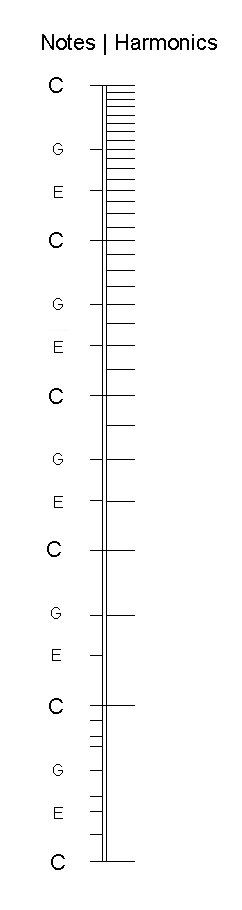 Out of all these emitted frequencies, the tone that has the strongest volume is the fundamental. All the rest of the tones are harmonics. The harmonics of a stringed instrument such as this actually are very mathematical. The harmonic series is shown below